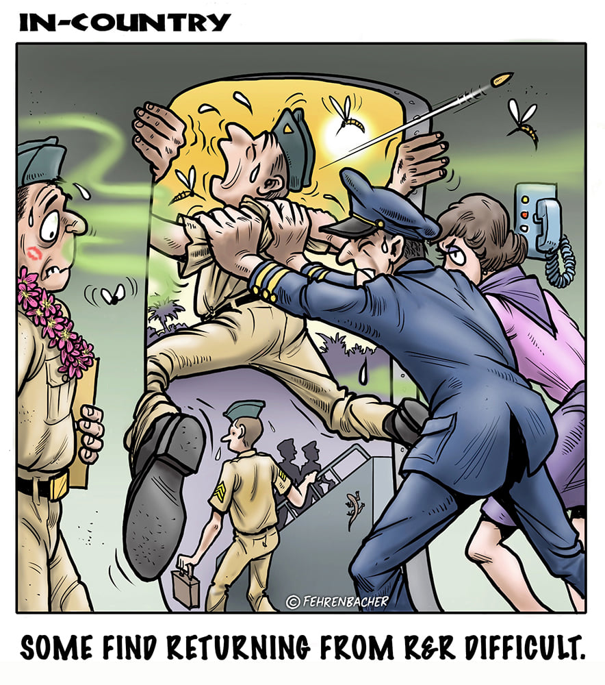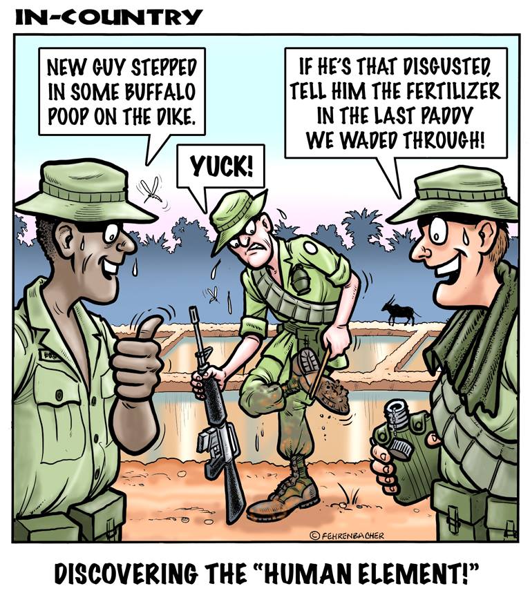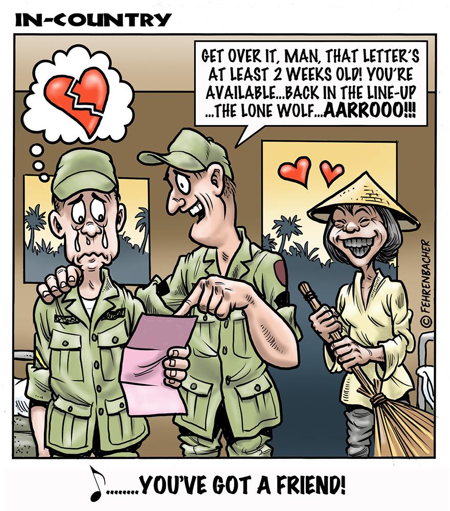 Phil enlisted in the Army in 1965 where you served for years in Vietnam. He became a graphic designer and has worked for the state of Oregon for 26 years. He retired in 2003 and started the Cartoon "In-Country". The cartoons reflect his experiences during his tour of duty in South Vietnam.